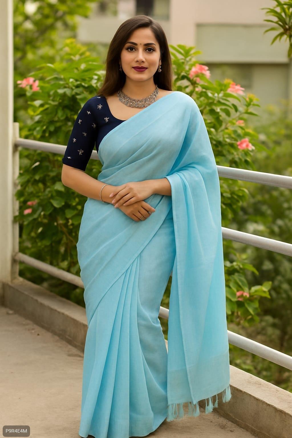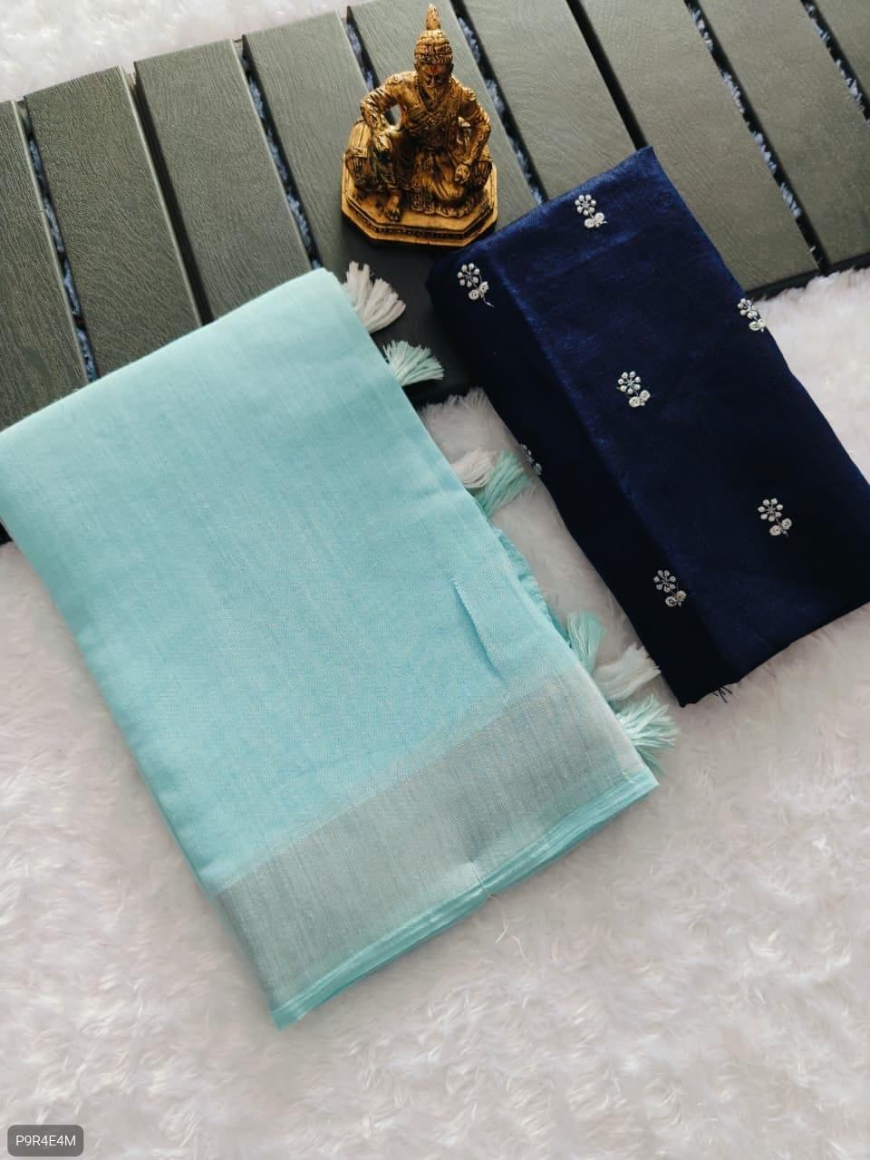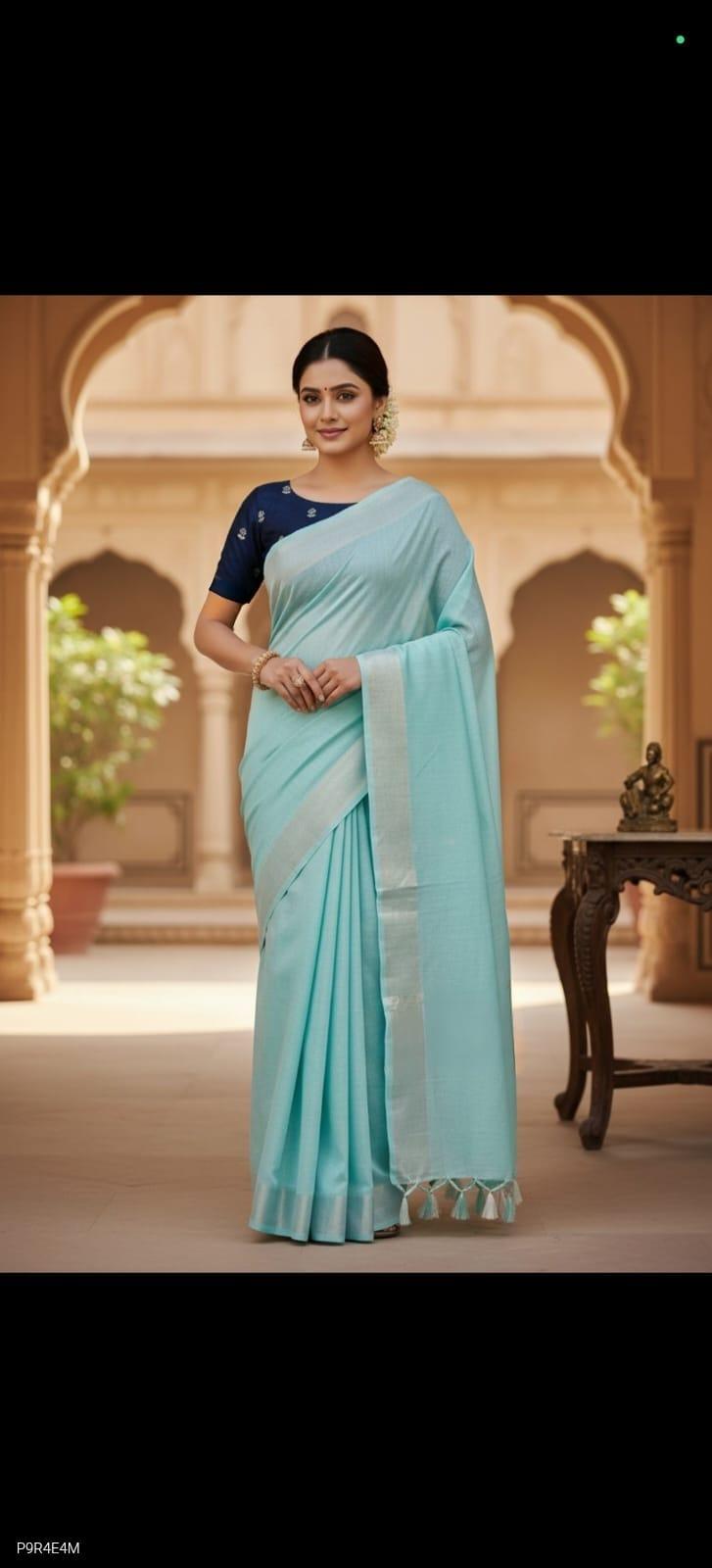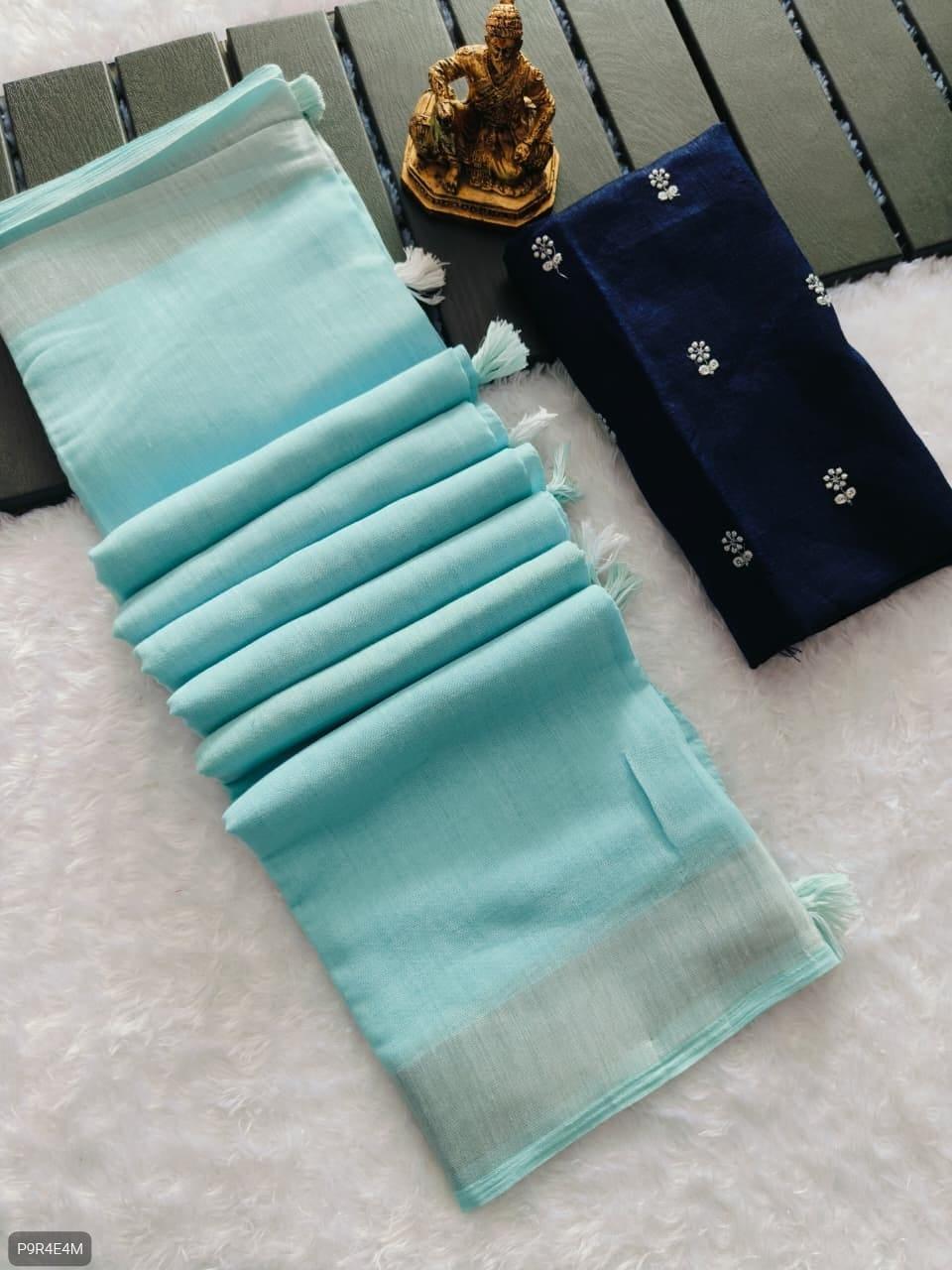 Description-Heavy Linen silk saree attached with tussels on pallu and perfectly matched silver coding work blouse piece